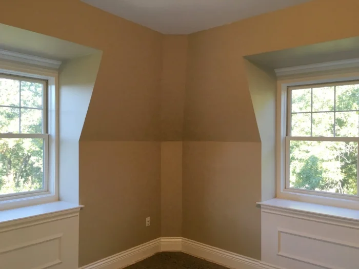 When we looked at the master bedroom, Louise had envisioned doing vertical stripes. I agreed that the stripes could look fantastic – but, the room has gabled ceilings that create complex angles where they intersect. Doing stripes on these surfaces would have created odd shapes no matter how they were painted – making an unintentional “fun house” look. While brainstorming, Louise suggested a strie finish – which I agreed would look great!
